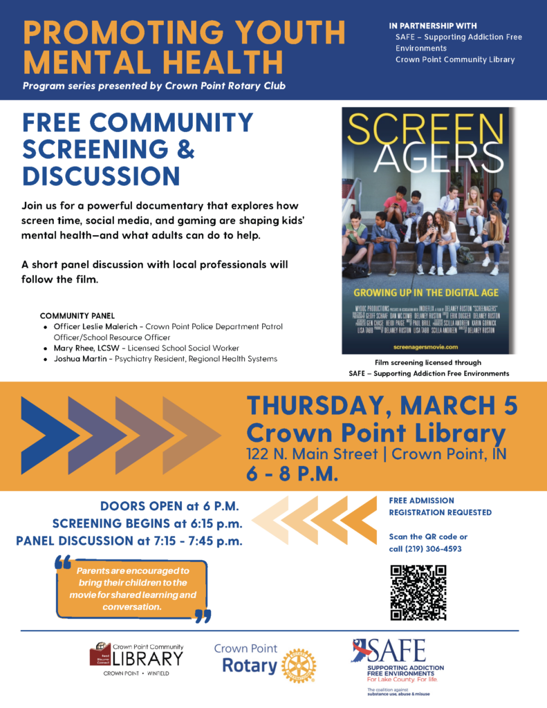 We recognize that mental health is a critical issue for our young people, and we all play a crucial role in guiding our youth toward healthy lives. I want to share information about a free community program sponsored by SAFE (Supporting Addiction Free Environments), the Crown Point Rotary Club, and the Crown Point Community Library.